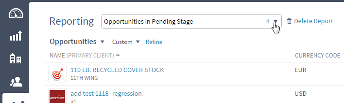 Deltek CRM saves the search, all filters, column selections, column order, grouping, and sorting that you have applied.