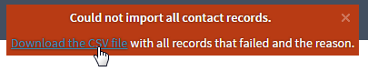 Click the Download the CSV file link in the message to review the records that were not imported and the reasons why the imports failed.