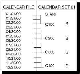 In this example, calendar set 00 would allow you to spread budgets and report on project costs on a monthly basis. To track project costs on a quarterly basis, you could create another calendar set:
