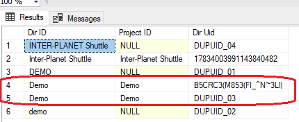 3. Identify if there are multiple rows with the same case and value in both the Project ID and Dir ID columns from the returned results after identifying the duplicate project names.