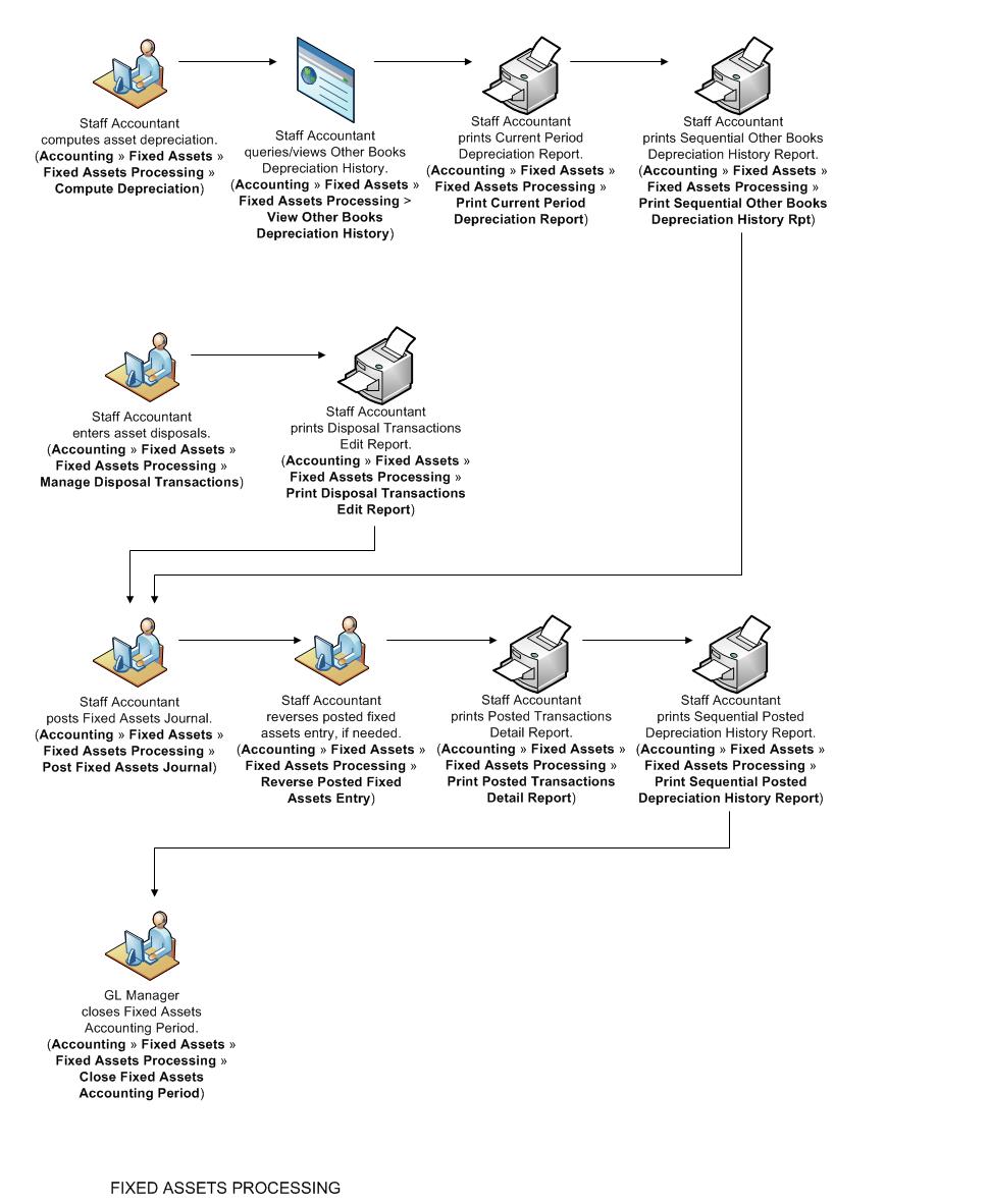 The Fixed Assets Task Flow 1 diagram describes the process involved in processing fixed assets.
