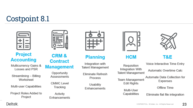 Costpoint 8.1 provides you with the latest project accounting, contract management, planning, HCM, and Time and Expense updates.