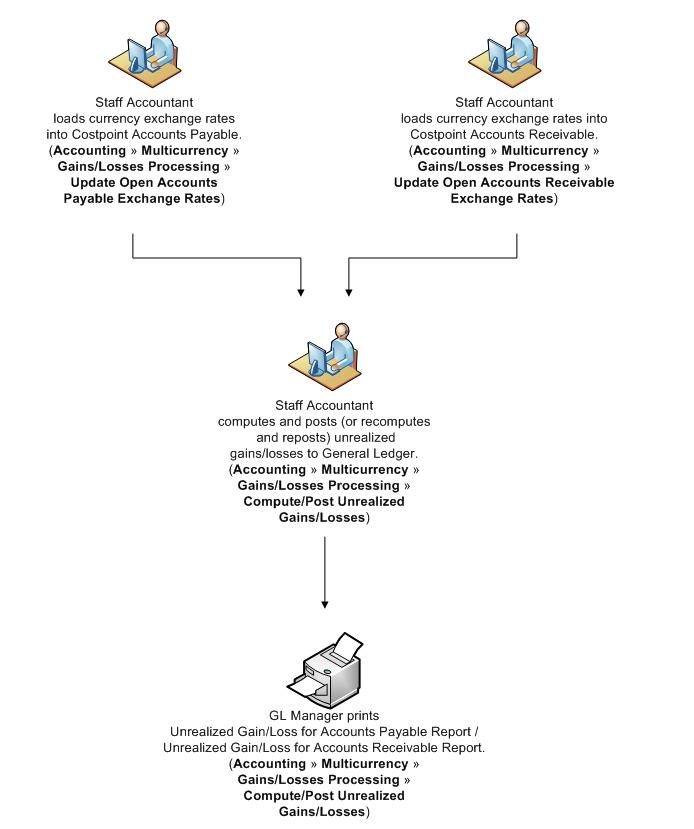 The Multicurrency Task Flow diagram describes the overall process involved in the Multicurrency module.