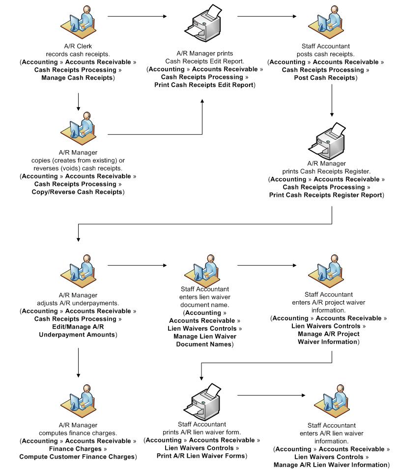 The Accounts Receivable Task Flow diagram describes the overall process involved in the Accounts Receivable module.