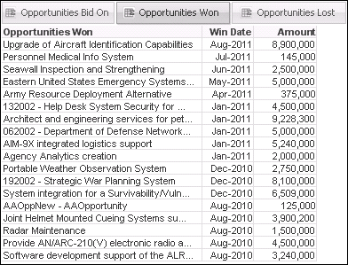 The Opportunities Won table displays a list of the opportunities for which you most recently won a contract, with the most recent at the top of the list. The table shows the month and year of the win and the unweighted estimated revenue for each won opportunity.