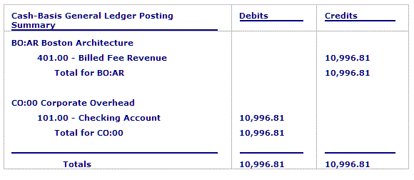 Assume that you post a cash receipt file with payments totaling $10,996.81. On the accrual side, this transaction posts as a credit to account 111.00, AR - Clients. For cash-basis reporting purposes, you set up revenue account 401.00, Billed Fee Revenue, and mapped this account to account 111.00.