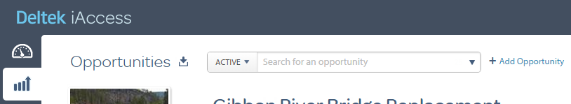 Use the opportunity search field above the opportunity title to display an existing opportunity. The search list includes both opportunities created in iAccess and those created in GovWin CM. Use the + Add Opportunity option next to the search field to add a new opportunity.