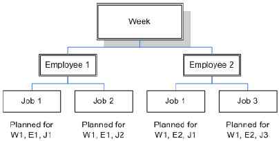 In this example, all of the hours shown for the second and third levels are hours that are planned for the week specified in level one. The information on one level is thus always relative to information on higher levels.