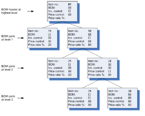 The level concept that this manual uses works as follows: The highest level of a BOM (level 0) is the BOM header. The BOM item parts at level 1 are the items and BOM headers that are attached in the sub-tab to the BOM header in the tab. The BOM item parts at level 2 are the items and BOMs that are attached to the BOM header at level 1. The BOM items parts at level 3 are the items and BOMs attached to the BOM at level 2, and so on. You see all of the levels of a BOM in one workspace.