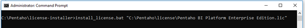 Alternatively, run Install_license.bat from <Installation directory>\Pentaho\license-installer in a command prompt or shell. Input the directory of the license files in the command, for example:
