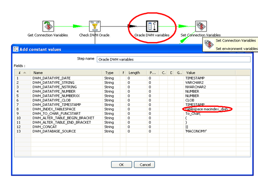 Oracle DWH Variables step (depending upon your DWH connection type) and set the right tablespace for the constant