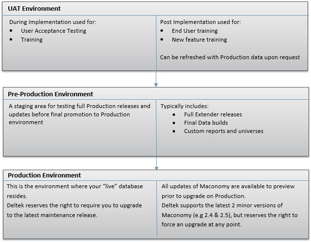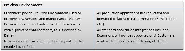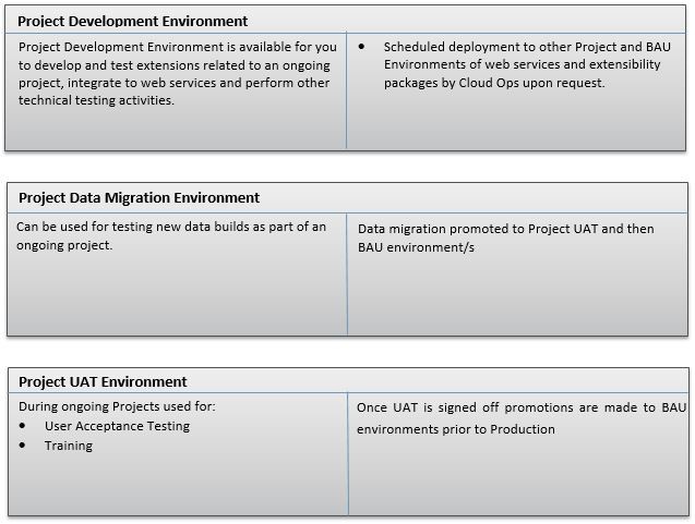 Enterprise Premium Cloud Customers have a total of 7 Environments for BAU. Development, Test, UAT, Pre-Production, Production, Production Support and Preview. Enterprise Premium Cloud Customers also have an additional Project bundle of environments to support any ongoing Projects without disturbing their BAU environments. Project Development, Project Data Migration and Project UAT.