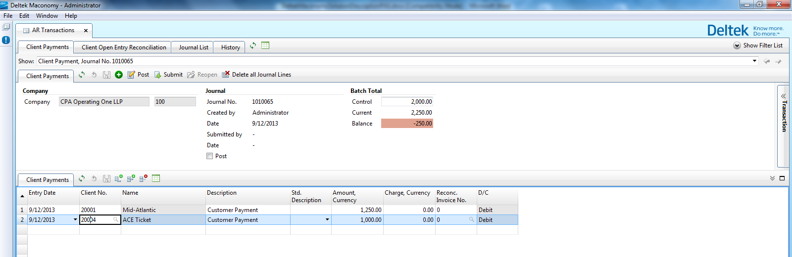 It provides an option for entering client payments in a batch process (enter multiple payments at once, and often reconcile them later), or you can enter client payments and reconcile them at the same time within the Client Open Entry Reconciliation tab.