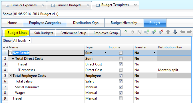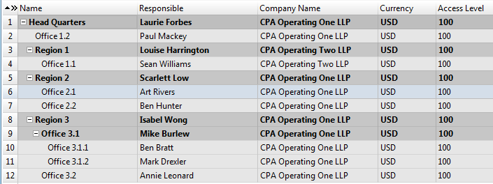 Dark gray lines with bold font are the Sum Budgets (described later in this document), which are used as a consolidation points for all subordinate budgets. Light grey lines are the Main Budgets which are used for the budgeting.