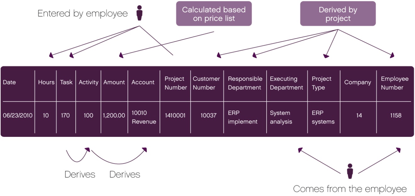 The department to which the project belongs, the customer, and the project type are derived from the project that the employee selected and indicated on all transactions.