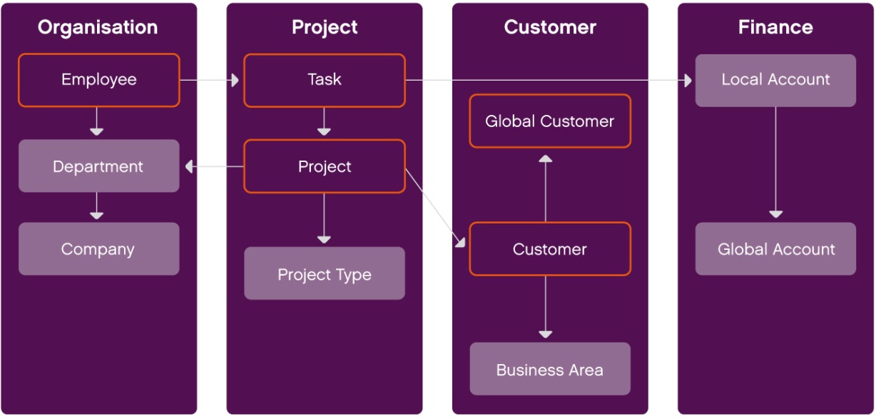 It is important to mention that the employee only selects a project and task when entering time and the solution automatically derives the rest.