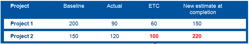 | ETC | Project upcoming costs using ETC | Focus on estimate to completion (ETC).The addition of actual costs and ETC provides you with a total view of what your costs will be when you are done, which you can then compare to your baseline. |