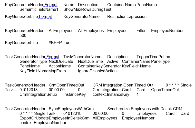 This section contains examples of background task generator imports for running the Open Timed Out action as a scheduled task and running the Export or Update Employee in Deltek CRM action on a set of employees.