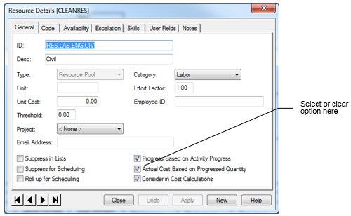 The manner in which Open Plan calculates actual costs depends on settings that you make on the General tab of the Resource Details dialog box for each resource assigned to an activity. For example, you can select the Actual Cost Based on Progressed Quantity option to have Open Plan calculate this value. If you select this option, the actual costs for a resource will be calculated and posted to the file when you run progress calculations. The actual costs posted will be calculated from the actual units (reported or calculated) multiplied by the resource rate.