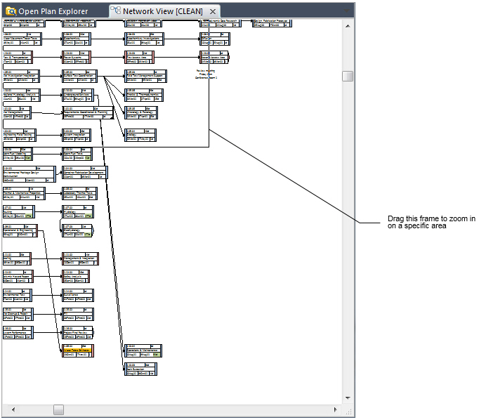 In a network view, Open Plan provides Zoom In and Zoom Out commands for projects that cannot be displayed on a single screen. If the entire project can be displayed at once, the Zoom commands are not available.