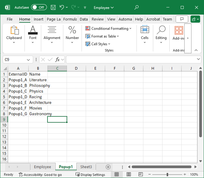 When you import this file, you must import the Popup1 entries before the Employee entries.
