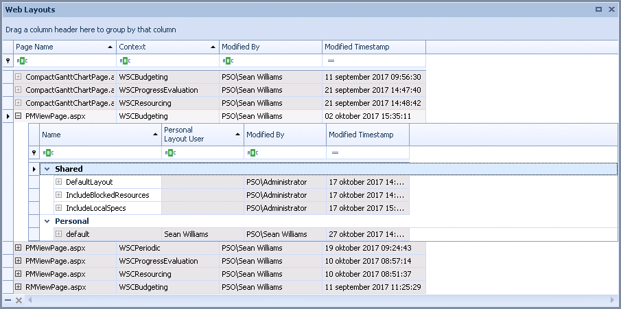 The main grid displays all of the default (standard) layouts. You can expand a default (standard) layout to see all of the shared layouts that have been created based on it. You can expand a shared layout to see all of the personal layouts that have been created based on it.