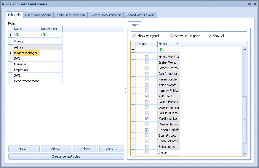 Assign a Role to a User Use these steps to assign a role to a user. To assign a role to a user: Select the Edit Roles tab. In the Users tab, select the Show All radio button. Select the Assign check box(es) for the users you want to assign to the role. Tip: See the Deltek People Planner Fundamentals Guide for more information about how to work with roles in People Planner. Parent Topic: Link Shared Web Layouts to Roles HomeAppendix: Technical ClarificationsManage Shared Web Layouts Administrator TasksLink Shared Web Layouts to RolesAssign a Role to a User