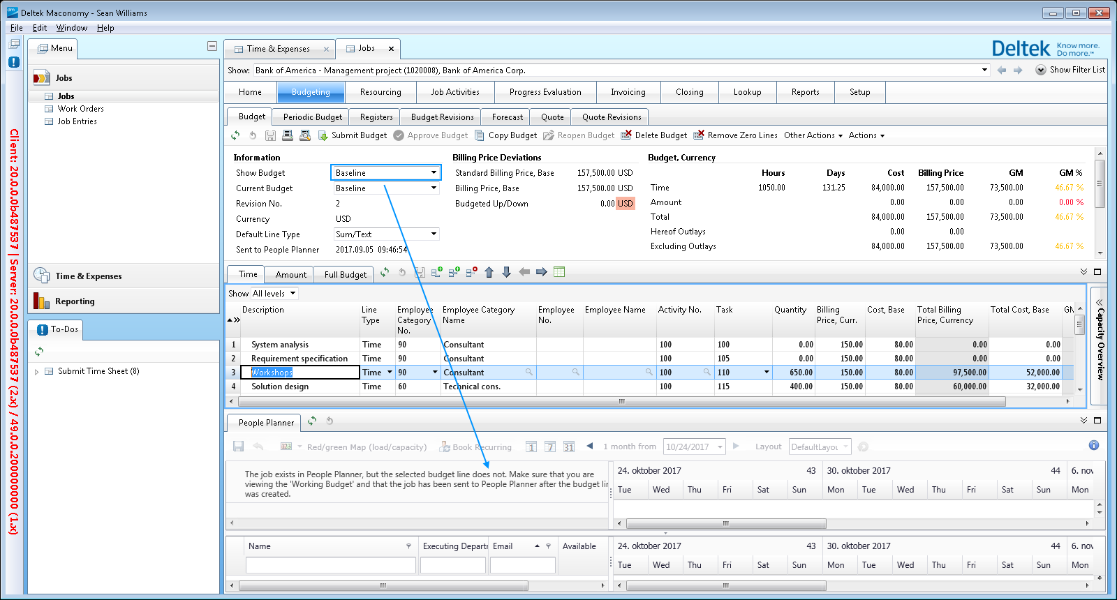 Maconomy supports having several budgets on a job, such as a Sales Estimate, a Baseline, a Working Budget, and so on. However, only one of these budgets is exported to People Planner, and this is the Working Budget.