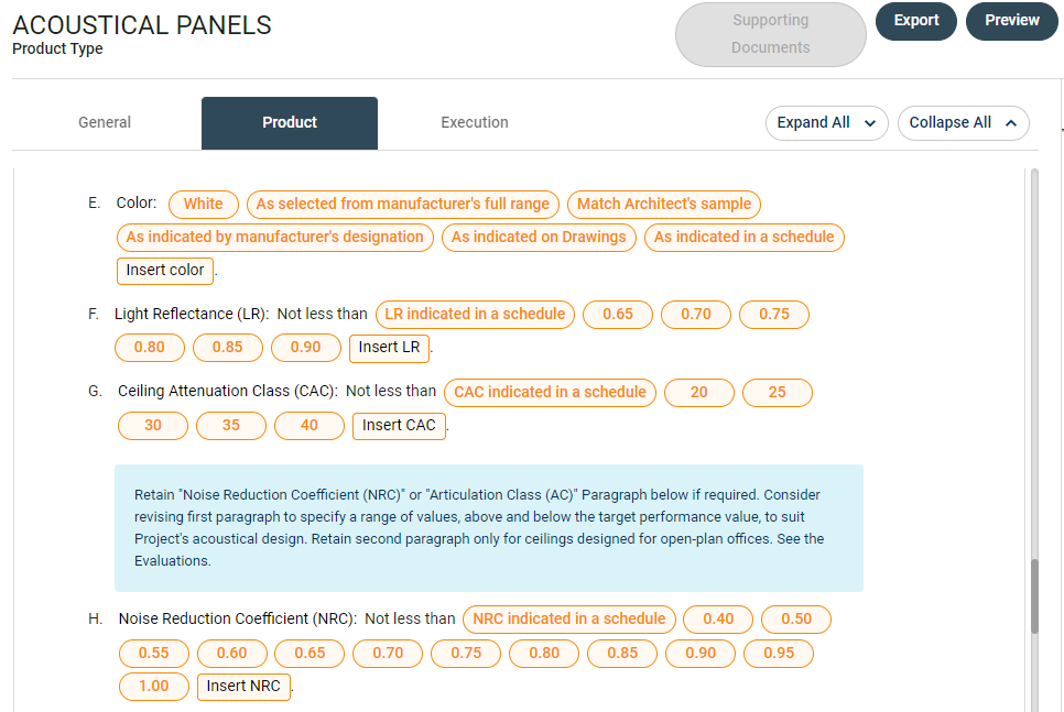 - Specify product requirements in your project's family, section, and product type elements to aid in your product selection.