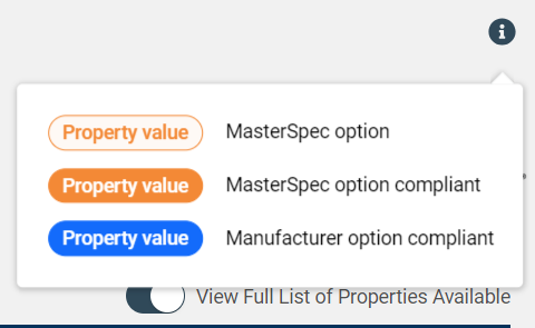 For each MasterSpec property or manufacturer property, the following items are available: