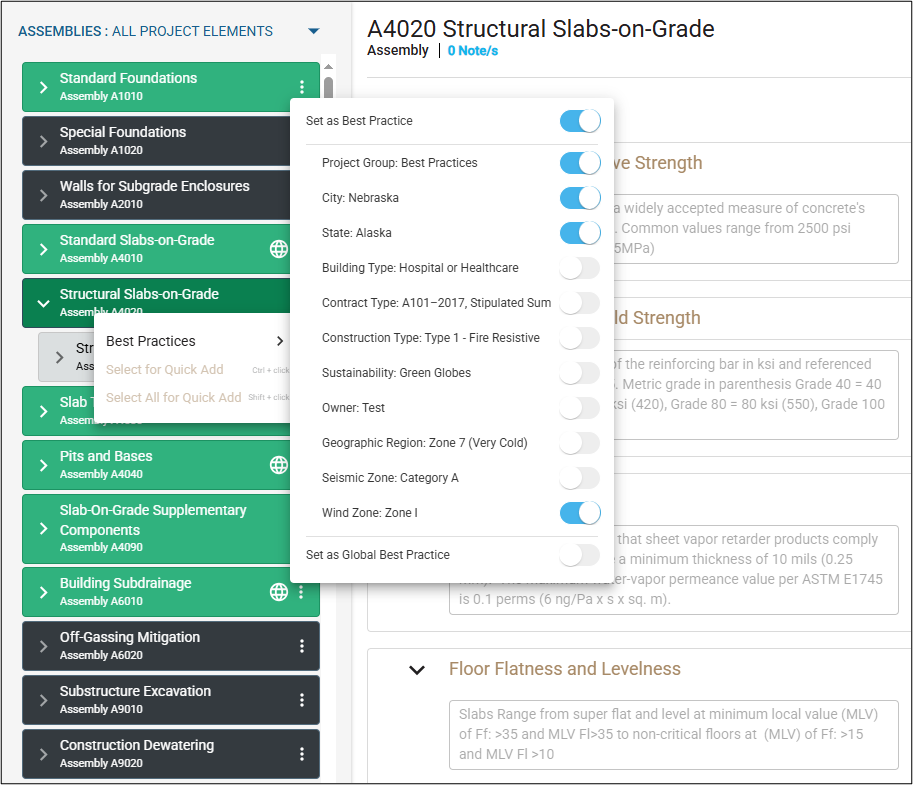 The best practices dialog box contains options for tagging items as either a project parameter best practice or a global best practice. For tagging a project parameter best practice, this dialog box includes additional options for selecting parameters to which the best practice applies. These project parameters are based on the active project's parameters and display their actual values for your reference.