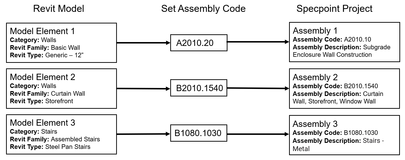 For example, for Model Element 1 with the Generic 12" Revit type, you set its assembly code as A2010.20. Specpoint will associate Model Element 1 to the A2010.20 - Subgrade Enclosure Wall Construction assembly. You can associate only one Specpoint assembly for each Revit model element. Set the assembly code for as many model elements as needed.