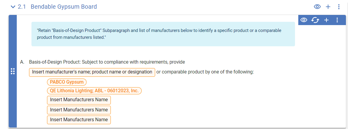 Similar to a MasterSpec BOD product paragraph, this paragraph enables you to select one product listing to use as a basis of design and select manufacturers and product listings as comparable products.