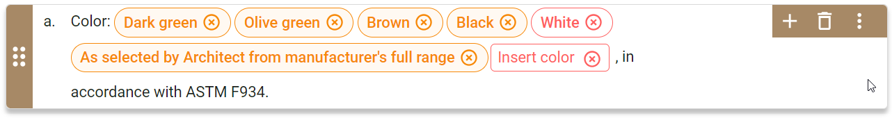 In a given paragraph, use an option set to provide your firm's design professionals with options for selection or input. This enables your firm's design professionals to specify properties according to their project requirements and within your firm-wide standards and best practices.