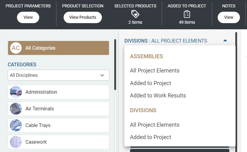 | Project Elements | This lists the following project elements based on the selected category, format, filter, and search criteria: