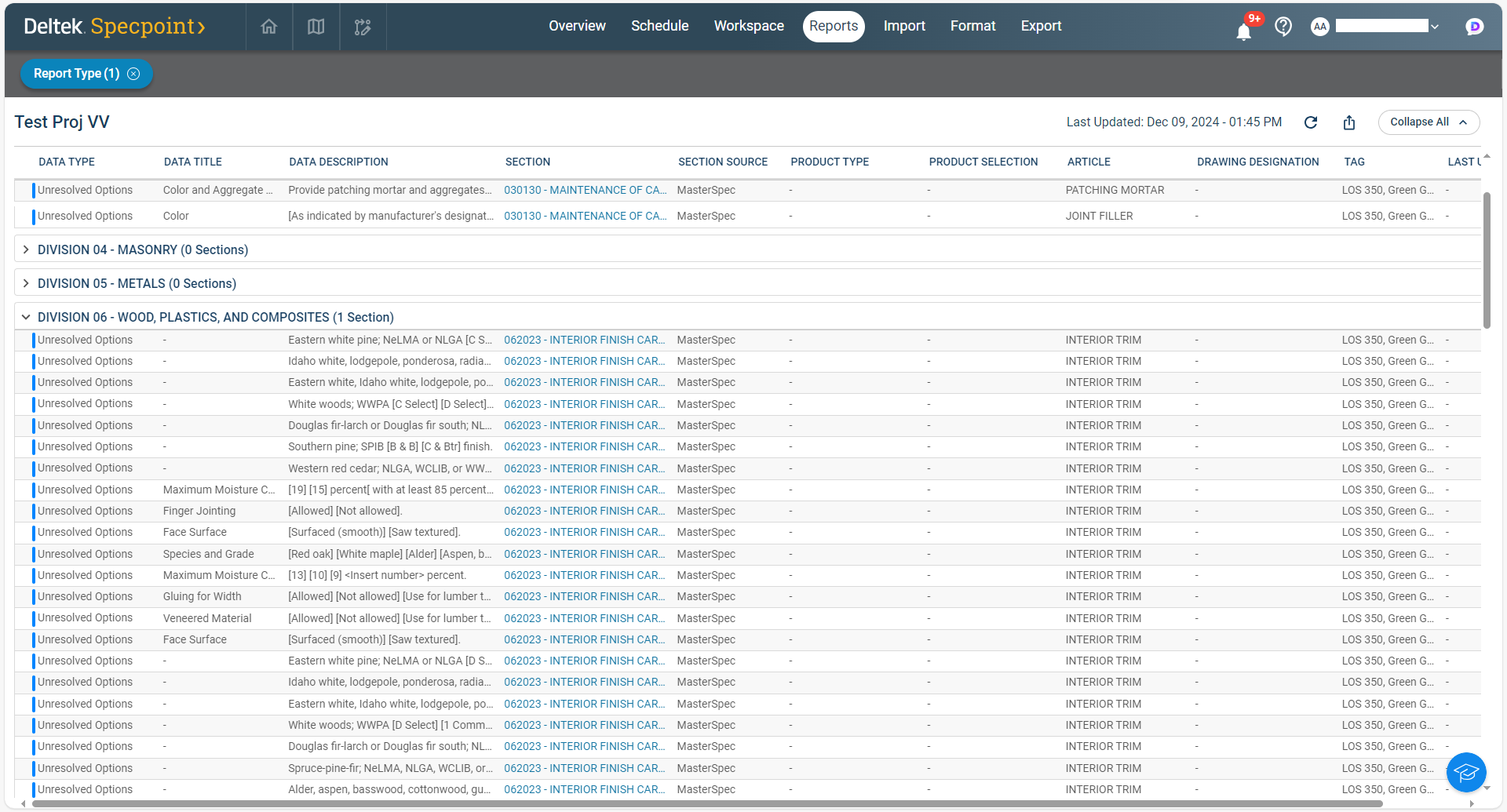Access an Unresolved Options report for a specific project to collect data on all paragraphs with option sets that lack user selections or entries.