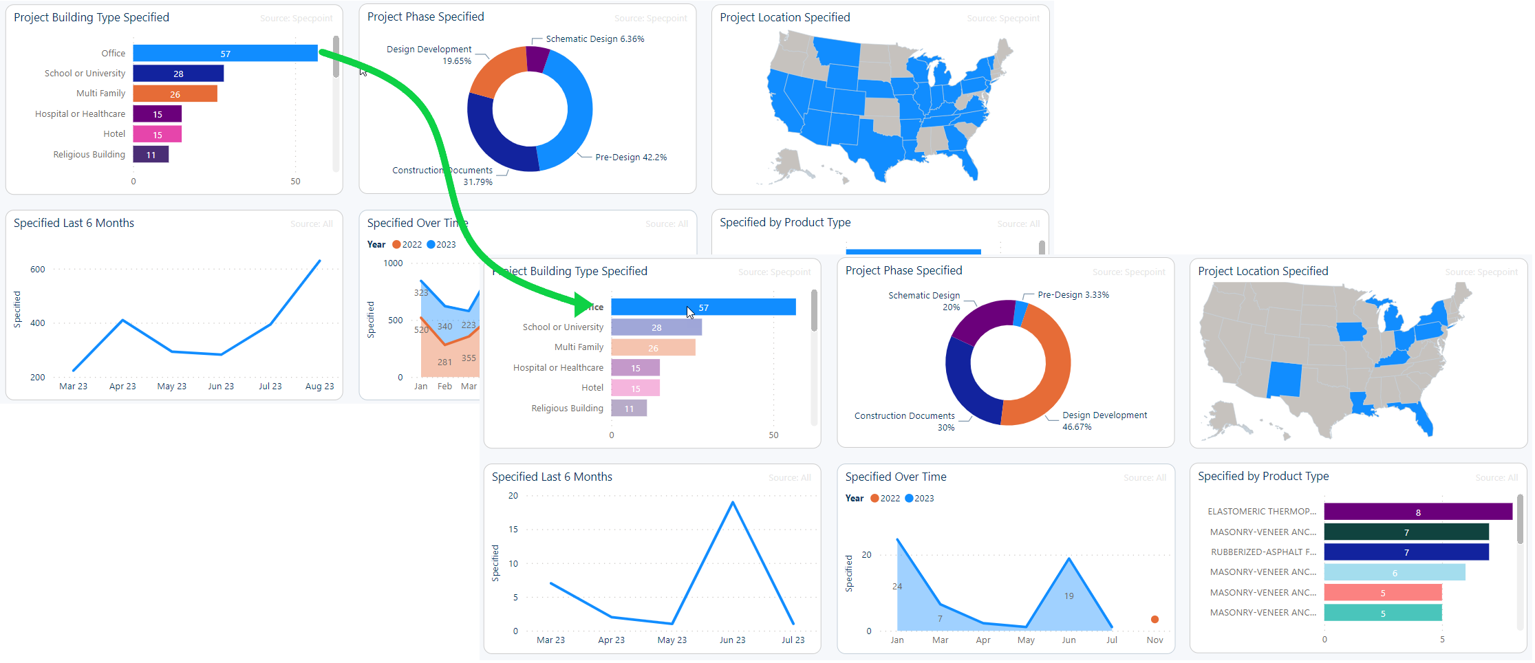 When you click a data point in a widget on the Industry Analytics page, the platform filters the available data in the remaining other widgets based on the data point that you selected. For example, you clicked a data point in the Project Building Type Specified widget, such as the specified count for Office. The platform filters the data in the Project Phase Specified and Project Location Specified widgets for only specified products for the Office building type.