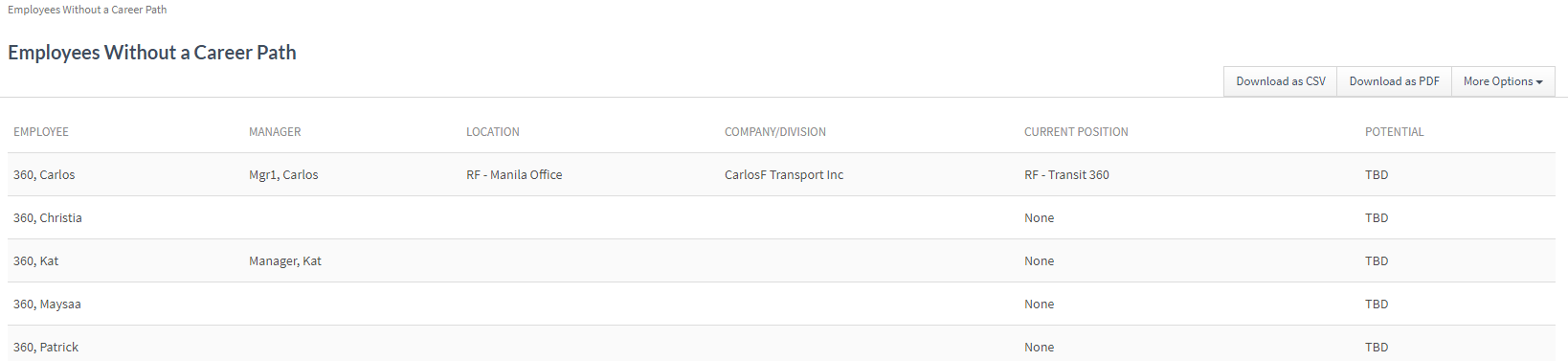 Sample Employees Without a Career Path Report