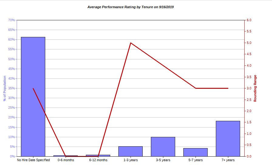 Use this report to view a graphical representation of the percentage of employees in specific tenure groups and the average performance scores for each tenure group.