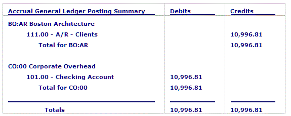 Assume that you post a cash receipt file with payments totaling $10,996.81. On the accrual side, this transaction posts as a credit to account 111.00 - A/R - Clients. For cash-basis reporting purposes, you set up revenue account 401.00 - Billed Fee Revenue and mapped this account to account 111.00.