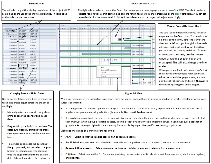 The Schedule tab includes a grid and an interactive Gantt chart where you can create dependencies between tasks.
