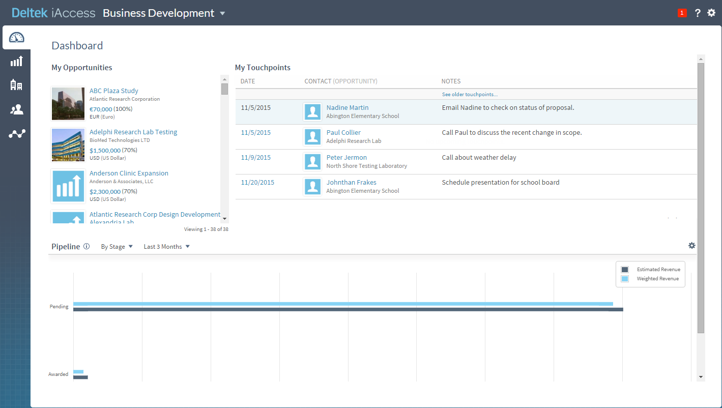 The Dashboard area of Business Development provides a list of the opportunities for which you are a team member, a list of your upcoming or historical touchpoints, and a Pipeline bar chart that displays estimated and weighted revenue for a set of opportunities that you select. You can break down the revenue on the chart based on any of a number of opportunity dimensions (for example, by client, by market, or by stage).