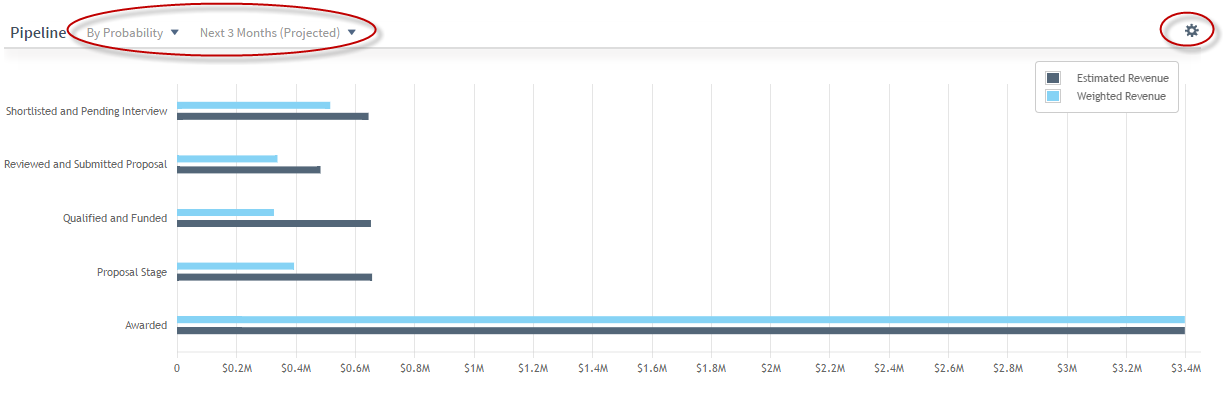 Use the controls above the Pipeline chart to select the dimension by which you analyze the pipeline revenue, the time frame for the revenue amounts, and the opportunities that are included.