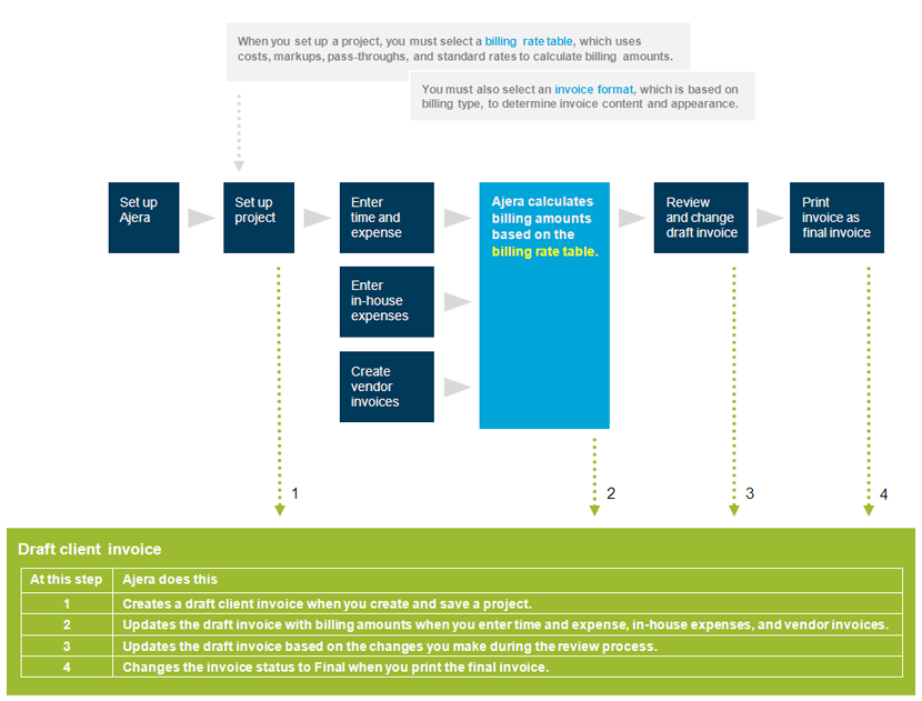 This section provides an overview of the billing workflow and billing calculations in Ajera. This knowledge will help you make the best decisions for your firm when choosing settings and processes related to billing.