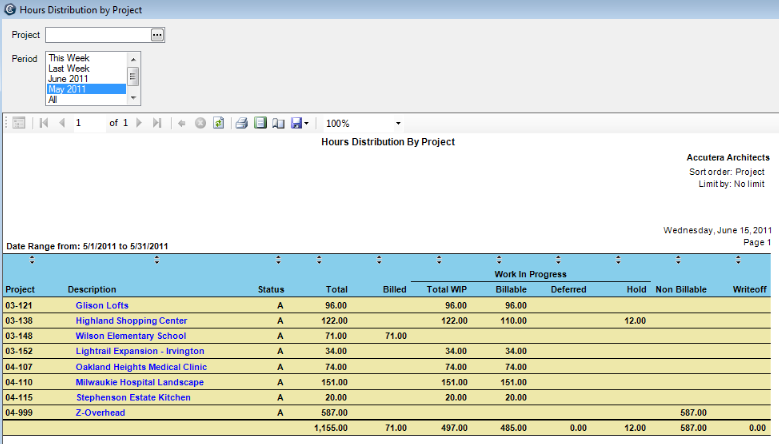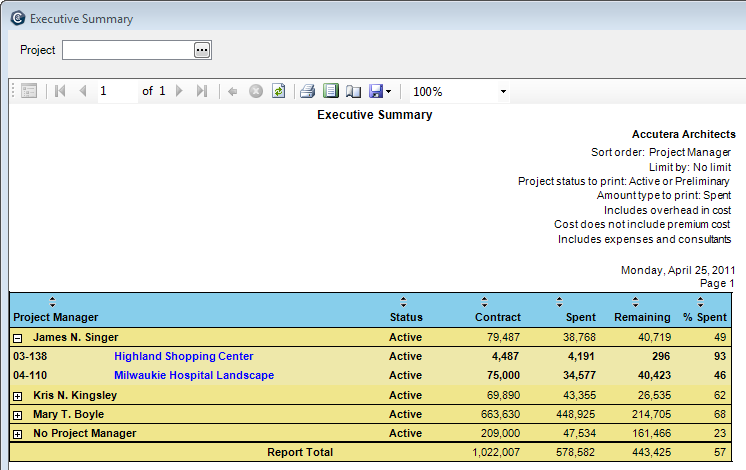 You can summarize information by project manager or principal in charge, and drill down to project, phase, and employee timesheet detail information.