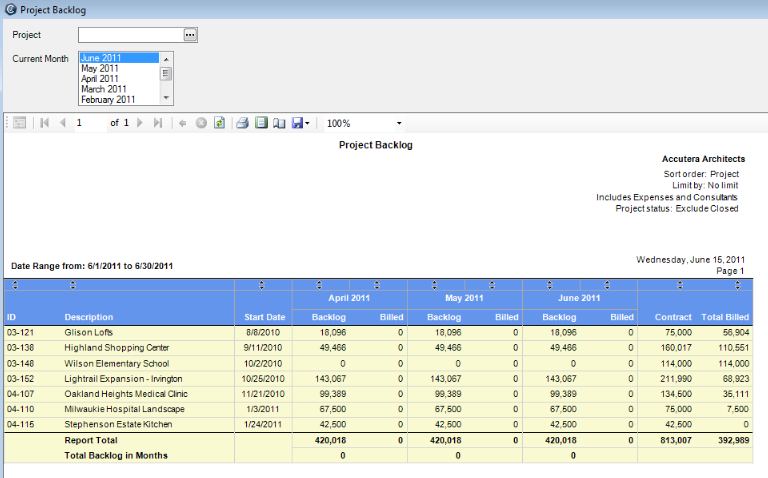 This report displays the backlog for the current month and previous two months. It includes only projects with an actual start date and contract amount.