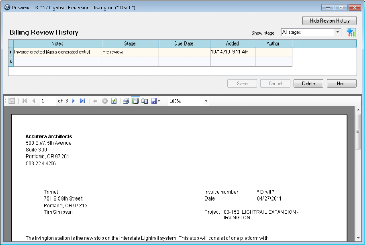 You can view the Pre-Billing Worksheet and the invoice from the Project Command Center by following the instructions in the next section, Review client invoices.