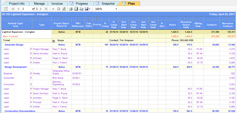 You can summarize information by project manager, principal in charge, project type, or department. You can drill down to project, phase, and full detail information.