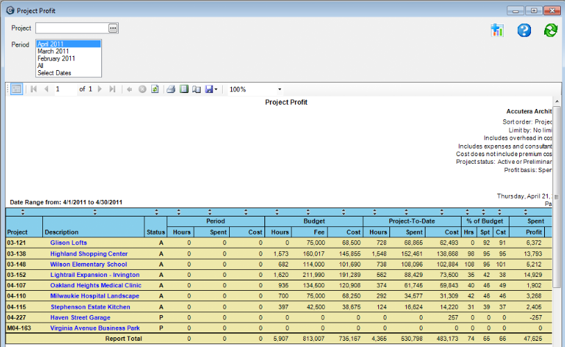 Use the Project Profit report to review what was spent in a selected period and project-to-date. It provides you with a quick look at budget-to-actual values including your hours and amounts for labor, expenses, and consultants. It shows percent spent and percent of profit for each project, along with budget amounts.