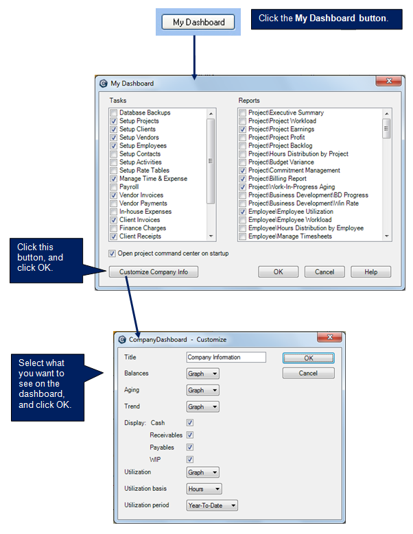 Display graphs and charts of key information for your company on your dashboard start-up page. It is an easy way to constantly review current information that reflects the state of your company.